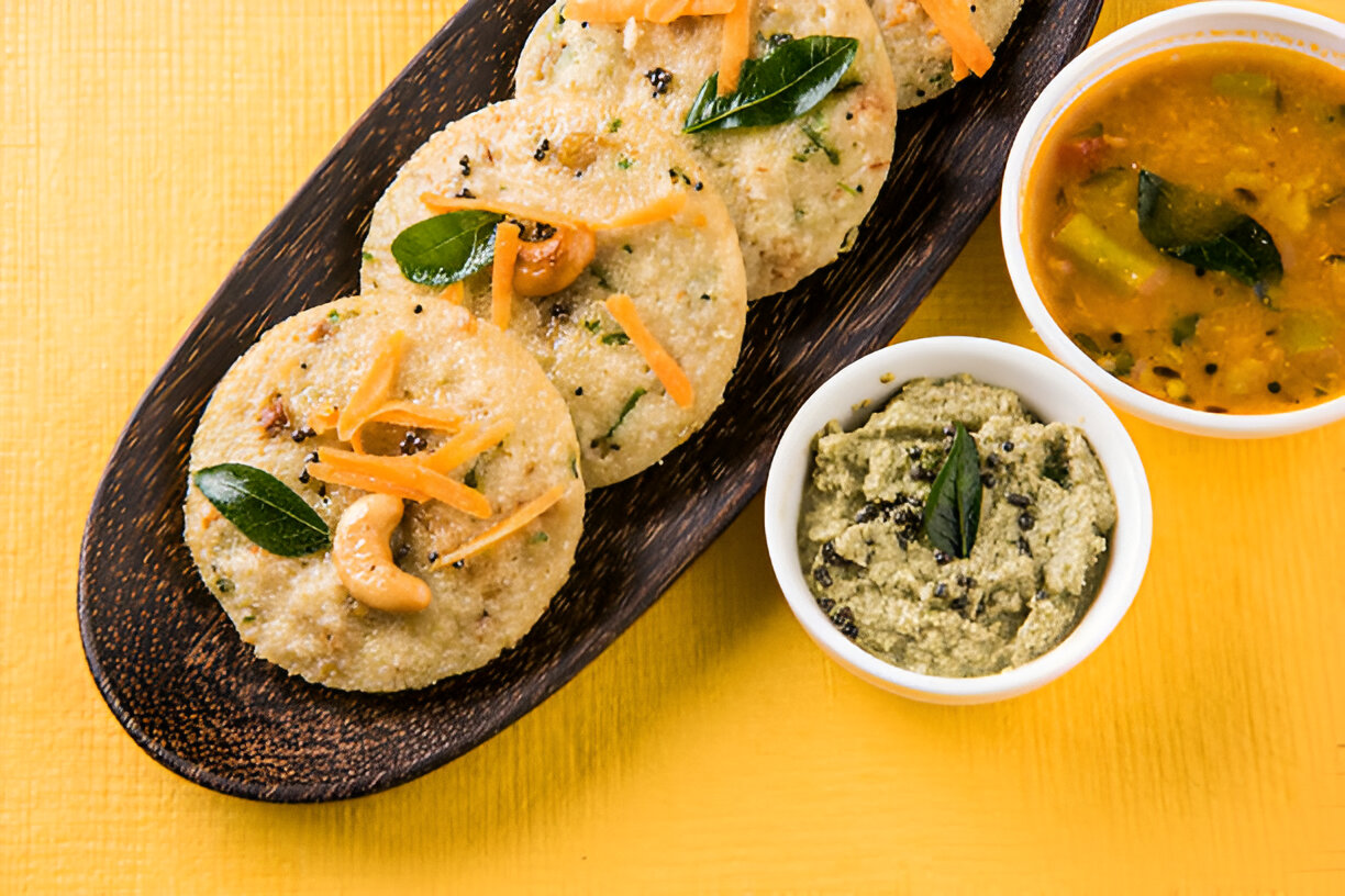 - Steamed rice cakes served with freshly ground coconut chutney.